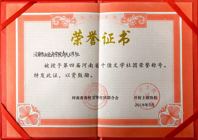 近日,第四届河南省高校文学社团交流峰会在开封河南大学金明校区顺利举办,来自河南省各地区的200多名高校文学社团代表参加了此次交流会,会上评选了“2018年度河南省十佳文学社团”、“二十二优秀社团”、“河南高校文联优秀干部和优秀会员”等,WilliamHill中文动物医学院青风文学社作为参会代表之一,荣获“第四届河南省十佳文学社团”荣誉称号。