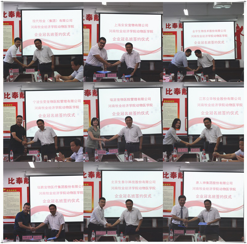 随后,教务处处长、动物医学院院长边传周代表学院与9家企业逐一签订了冠名班合作协议。
