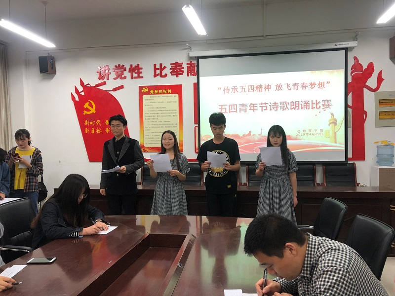 本次诗歌朗诵主题为弘扬五四精神,放飞激情,讴歌伟大时代,畅想美好未来。经过初赛26组比拼,角逐出本次决赛的九组选手,参赛者在选题中结合自己对五四精神和伟大祖国的所见、所闻、所感、所思,选取适合的朗诵篇章及背景音乐或背景视频,整体效果庄严而不失热情。朗诵选手台风稳健,着装、仪表端庄,举止自然大方,根据朗诵内容或豪迈奔放,或沉稳优雅,或激昂慷慨,或沉雄低回,充分体现了我院学生朝气蓬勃,昂扬奋进的精神面貌,使台下的评委和观众深受感染。经过一个多小时的角逐,根据在场评委公平公正的评分,其中18动检班黄紫薇和李岩组凭借《五四铭诗》的激情朗诵荣获一等奖,18动医02班丁建强《我的中国心》和17兽医01班李江鹏《沁园春·长沙》 荣获二等奖。刘思焱、张仓宁、董艺源、乔钧培获得此次活动的三等奖。最后,学院团总支书记王宏魁老师就本次五四诗歌朗诵比赛做出总结点评,他指出选手朗诵时语言清晰、响亮、富有丰富感情,同时也将现场的气氛一次次推向高潮。希望同学们能够铭记历史,学习和传承“五四”爱国精神,就要从身边的事做起,用自己的行动,为中国特色社会主义的发展贡献一份力量。