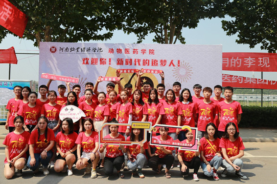 为庆祝新中国成立70周年华诞,今年我院以红色迎新为主题,为辅导员和助理班主任定制祖国70周年红色T恤,并精心设计新时代正能量班级引导牌和迎新标语。“爱我医药一生荣耀”、“七月的李现八月的肖战比不过医药学院你的出现”、“牧院处处小欢喜专业只选药和医”、“此门一迈是桃李 此生只爱是医药” 等迎新标语吸引了众多学生的目光。