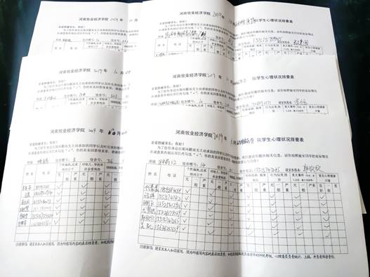 我院心教部成员于10月18日,向各个班级发放心理健康调查表,对我院全体学生的心理健康状况进行排查。通过本次普查,使班主任老师更全面的掌握了同学们心理健康的整体状况,对可能存在心理问题的学生进行了谈心谈话,帮助他们走出心理困惑,拥有更加积极健康的校园生活。