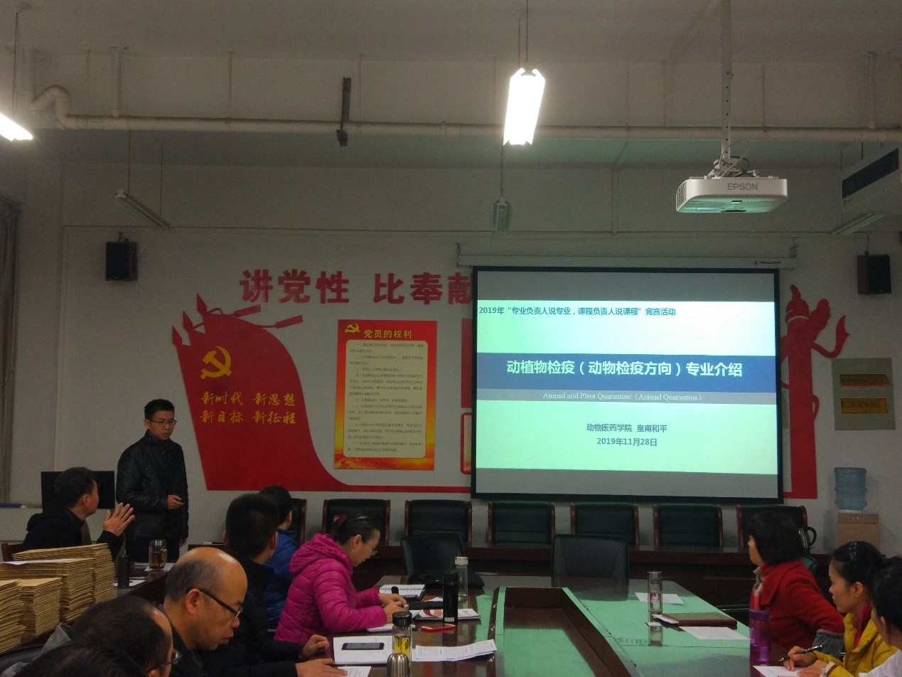 参赛选手分别就各自所代表的《动物医学》、《动植物检疫》、《动物药学》和《制药工程》专业的建设背景、人才培养方案的定位和模式、课程体系开发思路与措施、专业教学团队建设、实践教学条件建设、教学管理体系与制度以及特色与创新等方面进行了充分阐释,并提出了各专业近年来培养学生过程中所遇到的问题和改进方案。经过激烈的角逐,最终由宋予震院长摘得桂冠,皇甫和平老师获得二等奖,樊克锋和樊国燕两位教师获得三等奖。