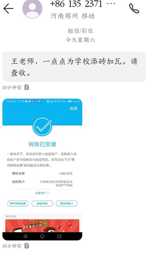 除了捐赠物资,我院另一名党员教师匡秀华博士以捐款1000元的形式表达了她对我校疫情防控工作的支持。匡秀华博士是原制药工程学院15年引进的博士,一向以热心助人而得到大家的喜爱。匡博士此次假期远在温州,因为交通问题不能直接参加我校的疫情防控工作,但是遥远的距离丝毫不能减弱她关心关注我校的热度,通过网上转账的方式,匡博士向我校校友会捐款1000元,这是我校校友会收到的第一笔捐款!