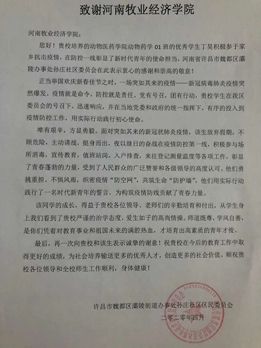 近日,许昌市魏都区灞陵街道办事处发来感谢信,对我院William威廉英国2019级动药一班学生丁昊同学在社区疫情防控工作中的突出表现予以表彰和感谢。