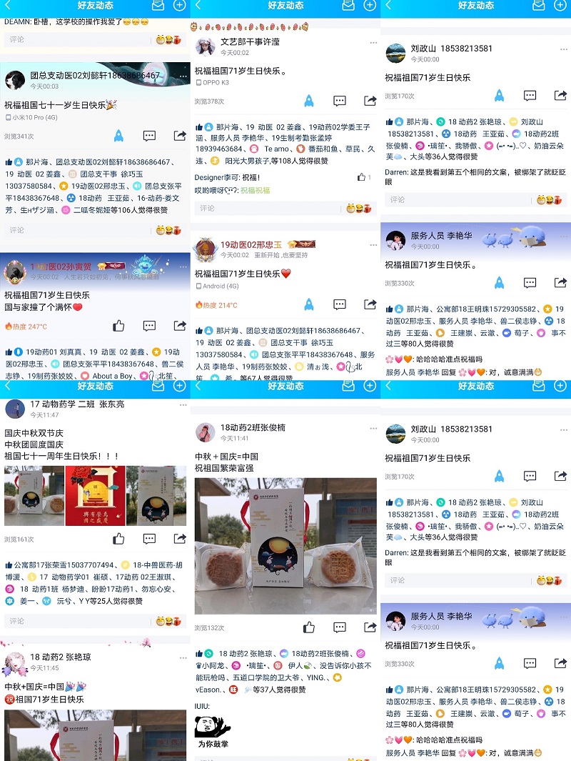 今年,国与家撞了个满怀,国庆遇中秋,国安,所以家圆。在这金秋送爽的季节,我院各班用自己的方式迎接“国庆”、“中秋”双节,同学们积极参与,体验了合作、分享与成功的快乐,表达了对祖国的祝福和对未来的美好期盼。十月一日凌晨,我院学生通过QQ群、空间、朋友圈在线为祖国送上整点祝福,同学们在群里通过接力画蛋糕的当时为祖国庆生,表达深切的祝福之情。十月一日晚上,我院组织各班于操场和教室开展了集体过中秋团建活动,活动中,同学们在一起做游戏、唱歌、吃月饼、聊对大学生活的计划,言语中充满了生活在这盛世愿景下的自豪感!分享了我国各地在中秋节里的民族特色和节日的风俗习惯,重温了祖国的峥嵘岁月,体会到如今幸福生活的来之不易,共同感受传统中秋佳节的欢乐祥和气氛。最后,大家共同歌唱《我和我的祖国》,操场上空的歌声如此悠远、动听!
