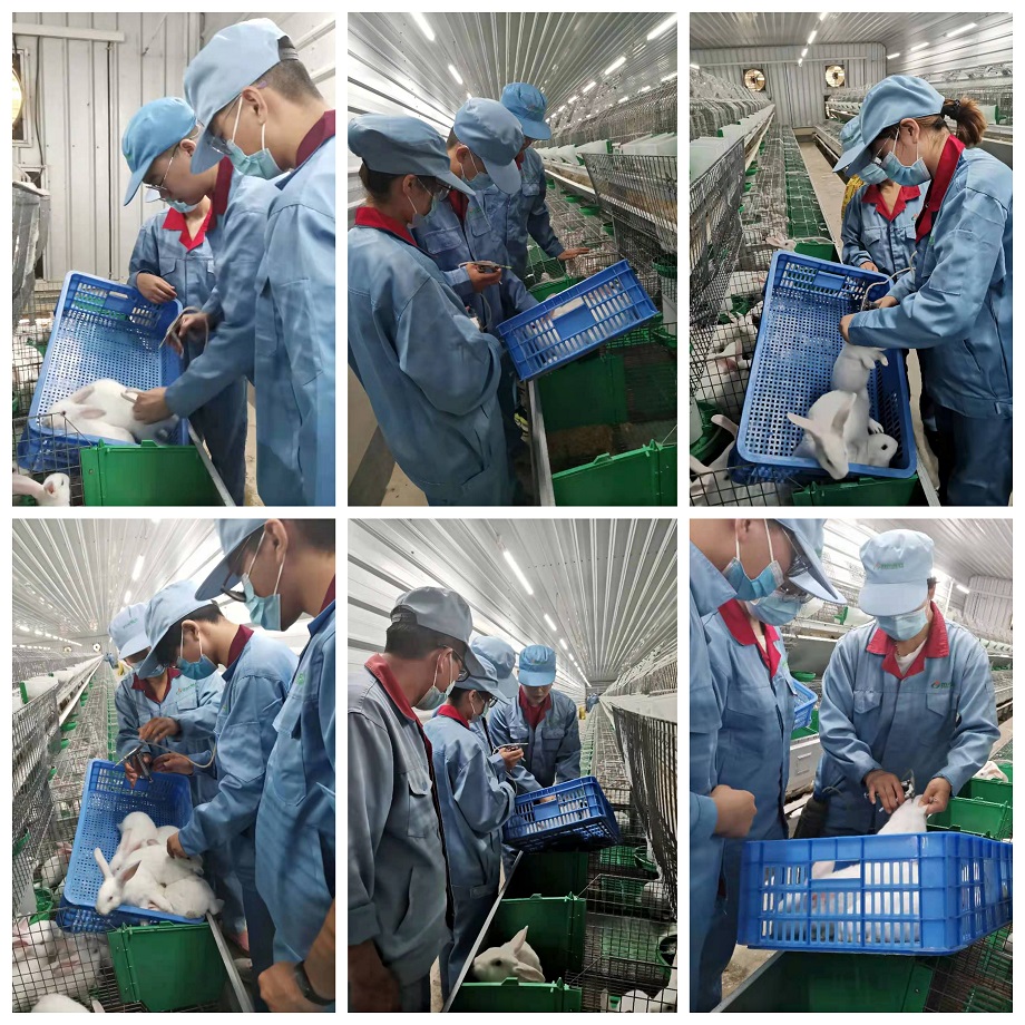 随后,队员们在厂区师傅的带领下分成五组进行实践,认真学习了规模化养兔中兔子的日常管理、常见兔病的防治、饲料的配方与加工,兔子的繁殖和哺育、兔舍环境控制及管理等知识。阳光兔业对兔病的预防工作也做得很到位,种兔会经常进行疫苗的防预,兔瘟、葡萄球菌和驱虫药物,定期进行免疫,可以有效地预防兔病的发生。队员们在各自师傅的带领下对种兔进行了疫苗注射,对仔兔进行日常管理比如喂奶和补奶。