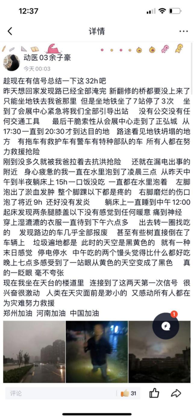 21日下午,余子豪同学从实习单位回家的路已经全部封闭,经过了3个多小时的路程艰难地到达了父亲的工作地福彩大厦。刚到没多久,在父亲的带领下一起加入了抗洪抢险的队伍。当时路上积水已经漫过腰部,水流很急,并且当时处在漏电出事的地点附近,情况十分危险。父子二人打着伞在水里行走,为需要帮助的人探路,引导着人们安全回家,遇到水深的地方及时告诫行人返回,发现马路两边的下水井及窨井缺失的地方就拿单车放在上面做好标记,警示过往行人,以免行人出现意外。父子二人为抗洪救援在水中整整待了9个小时,余子豪同学从中午午饭后15个小时一口饭也没吃,右脚磨烂的伤口也在水里泡了9个小时,左脚泡的瘀血发肿,直到凌晨三点才返回家中。
