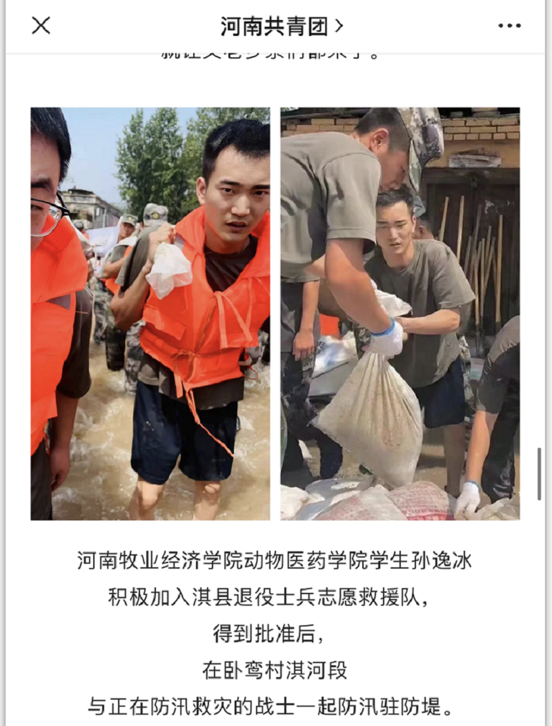 灾难无情,人间有爱。在防汛救灾中,像孙逸冰同学这样迎难而上、主动担当的动医药学子并非个例,不少学生或以志愿者的身份奋战在防汛救灾的一线,或是通过爱心捐助把关爱与温暖传递。一个个挺身而出的身影,一幕幕感人的瞬间,灾难背后是每一个平凡人的挺身而出,是每一个普通人的倾力相助。医药学子闻“汛”而动,尽锐出战,青春冲锋,用热血和奉献筑起了守卫中原的“青春堤坝”,助力打赢防汛救灾保卫战。(文/宋宁图/孙逸冰)