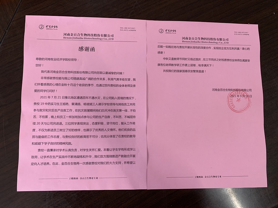 院党委副书记汪洋介绍了我院各专业的实习情况,对学生在实习过程中的表现给予充分肯定,特别对2019级中药班同学王旭艳、章清鸽、杨斌斌的表现重点提出表扬。郭总谈到7月21日在公司遭遇暴雨陷入困境的情况下,三位同学与其他员工共同参与救灾和灾后生产自救工作,在抗灾救援期间他们白天冲在救灾第一线,不怕苦不怕累,晚上和大家一起加班加点参与公司生产自救,持续20天和公司共进退,得到了公司领导和员工的高度赞扬。金百合公司对我院学生的专业知识、工作责任心给予了肯定,并对学院能够培养出满足企业需要的优秀人才表示感谢。