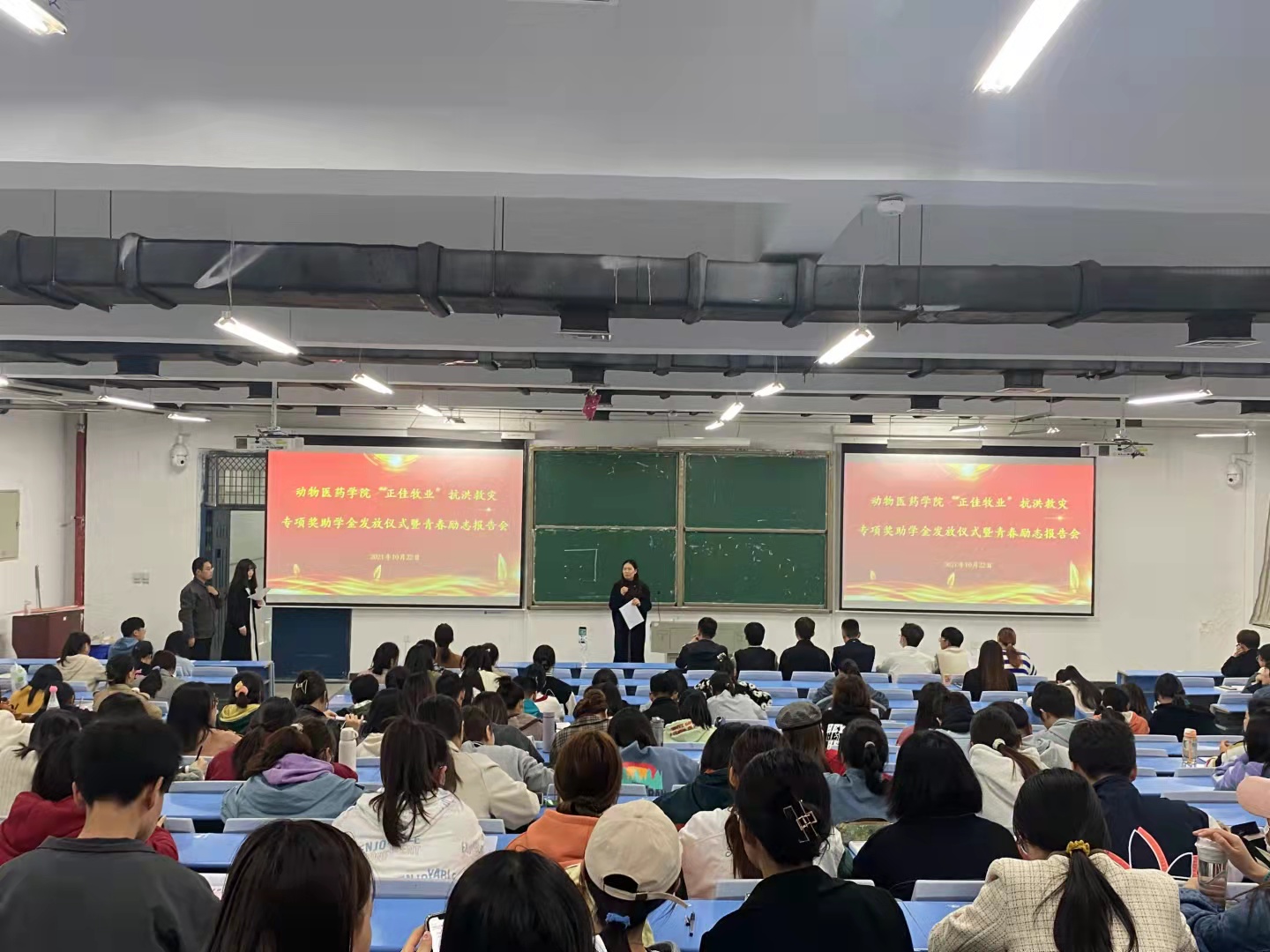 首先,院团委副书记樊明明详细介绍了“正佳牧业”奖助学金的设立背景,她告诉同学们:“河南今夏遭遇“720”暴雨袭击,多地发生严重洪涝灾害,我院学子展现社会担当,深入救灾一线,同时也有部分学生家庭受灾严重,经济出现临时困难,为了帮助受灾学生渡过难关,激励返乡大学生积极参与抗洪救灾,我院联合正佳牧业有限公司设立了该项奖助学金。”接着,院团委副书记樊明明和聂丹为此次受灾学生和抗洪学子学生代表颁发奖助学金。最后,被人民日报、河南省教育厅等多家媒体报道的退役学子孙逸冰和抗洪抖音视频点击量超过百万的陈思宇同学为同学们讲述洪涝灾害的一线救援行动,让同学们深刻感受到,要把小我融入祖国的大我、人民的大我,与人民共命运,这样才能更好地实现人生价值。