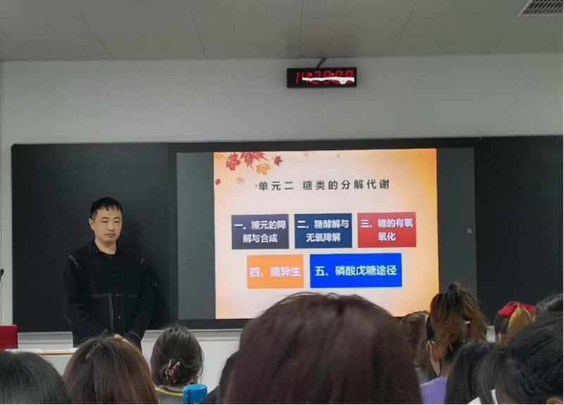 徐志坤老师的授课内容为《动物生物化学》课程中的三羧酸循环及能量计算。为了讲好本章内容,徐老师精心设计了课堂教学。授课之初,徐老师用PPT进行演示,带学生回顾了三羧酸循环的反应过程,课程生动形象,重点突出,对此学生们表现出浓厚的兴趣。随后徐老师讲了三羧酸循环的意义,课堂中与学生互动频繁,并结合雨课堂进行了随堂测试,不仅充分调动了学生的积极性还能巩固知识,教学效果较好。