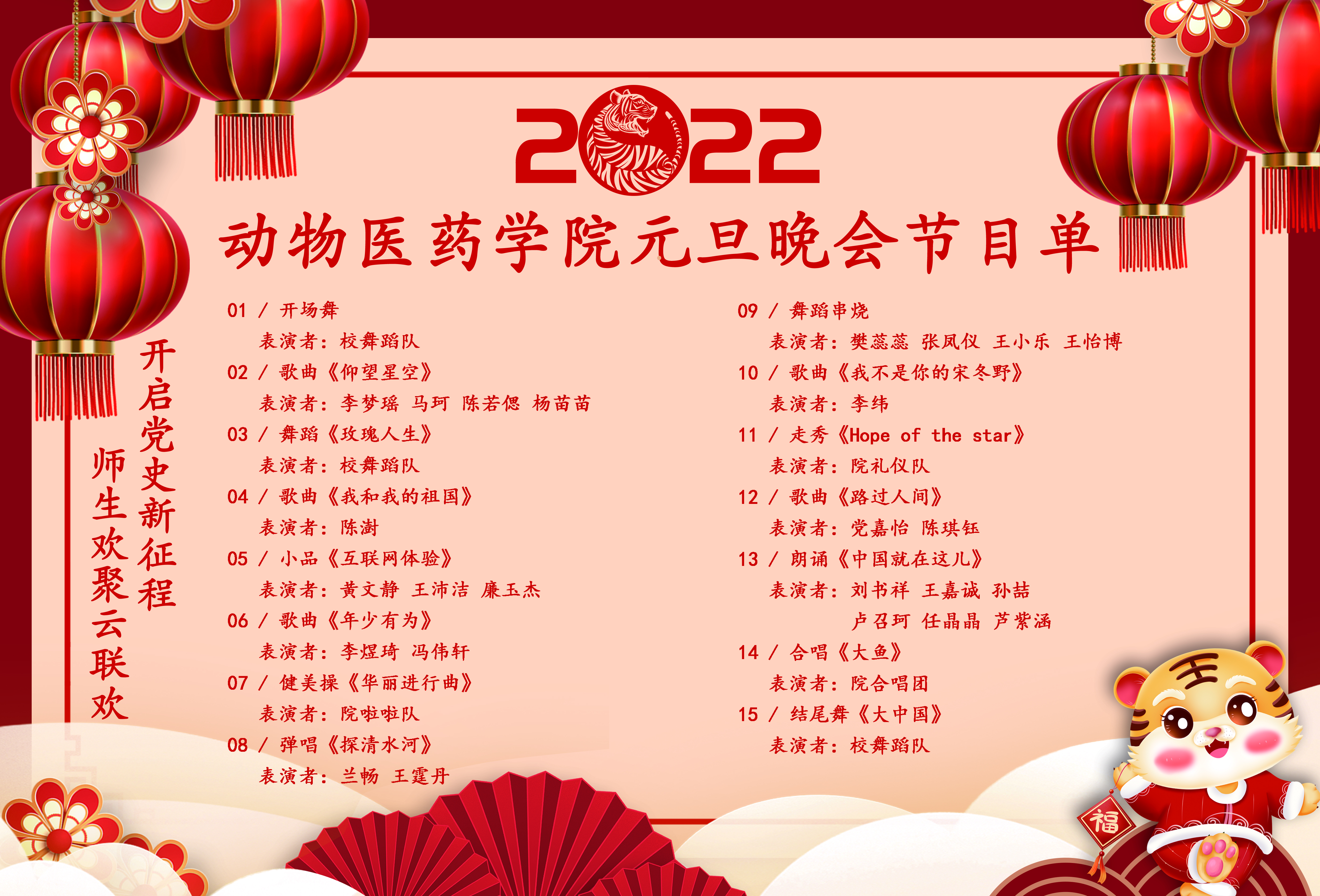 本次元旦晚会,从筹备到制作,共耗时1个月,我院从各个部门和个人参报的节目中精心挑选15个节目,歌舞、走秀、朗诵、小品、乐器等各类节目轮番上映,让人赏心悦目。晚会开始,酷劲十足的街舞舞者,用他们的舞步,拉开了元旦晚会的序幕;小品《互联网体验》,虽是一段荒诞幽默的体检,但他们用生动的表演诠释了大数据时代普通人的困扰;《舞蹈串烧》中,同学们用动感的舞步和节拍让新年的寒冬也热情似火;走秀《Hope of the star》,他们用自信的步伐和无与伦比的魅力展示我们动医药学子的风采;朗诵《中国就在这儿》,同学们像一个个满腹经纶的诗人,虽是用不同的身份在讲述不同的故事,但故事中充斥着相同的爱国情怀。最后,晚会在舞蹈《大中国》中圆满结束。