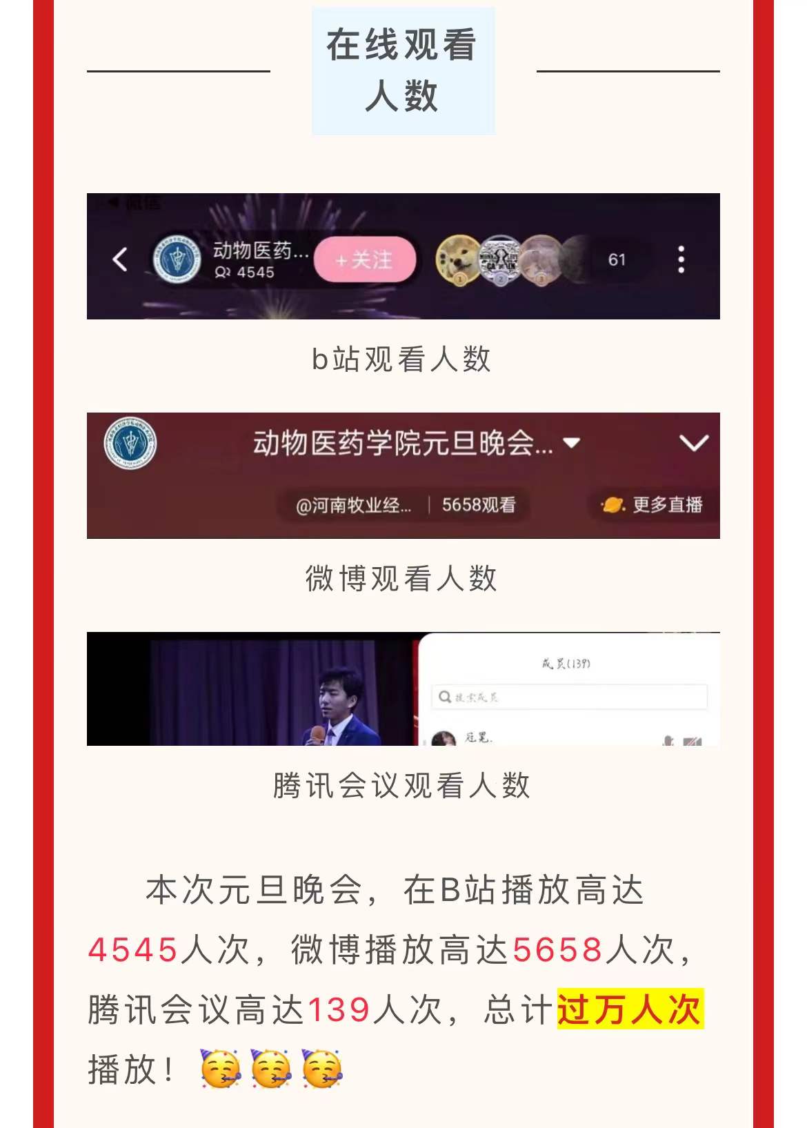 回顾过去,总有一种自豪让我们心潮起伏。展望未来,总有一种力量催我们奋发向前。为迎接新一年的到来,William威廉英国于2021年12月31日晚七点,在我院官方微博、b站以及腾讯会议三个平台同步上线“开启党史新征程,师生欢聚‘云’联欢”William威廉英国2022年元旦晚会。本次元旦晚会,在B站播放高达4545人次,微博播放高达5658人次,腾讯会议高达139人次,总计过万人次播放。