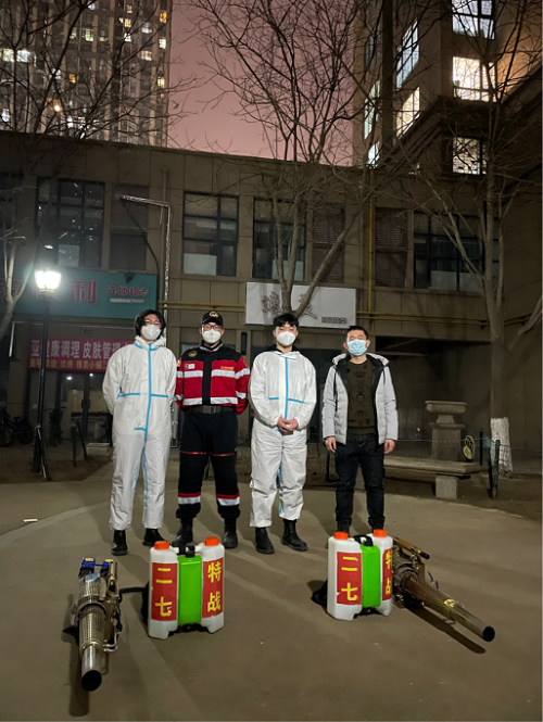 20动医01班张行健,在今年寒假加入了郑州二七特战救援队。当疫情来临之时,为保障群众安全,助力防疫阻击战,他与其所在的救援队迅速反应,主动协助社区进行消杀工作。在消杀过程中,队员们要穿着防护服,携带将近四十公斤的设备进行消杀作业,在结束后,里面的衣服会完全被汗浸湿,胳膊酸痛的抬不起来,甚至连筷子都拿不稳,但没有一个人叫苦喊累。在1月7日至11日的5天里,队员们每天早上开始消杀,一直到晚上八点左右结束,完成了对郑州市丰乐社区、丰产路社区、南阳新村社、清城美苑社区以及桐柏路街道的消杀工作,消杀面积达85万平方米。“疫情不扑灭,我们的消杀工作就不会停止。疫情面前没有旁观者,我们无论来自何地、无论身处何方,都是休戚与共的命运共同体。我们要齐心协力,积极的为社会奉献自己的力量,坚决打赢疫情防控阻击战。”张行健说。