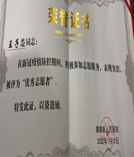 2022年,在打响新冠肺炎疫情防控战的时期,河南省焦作市解放区河阳社区工作成倍增加。我院21动医03班杜宇,于2022年1月10日加入志愿服务的队伍,每天早晨8点到岗,进行日常卡点执勤工作,查看来往人员的健康码及行程卡等。定时定点于单元门口喷洒消毒液。他说:“新冠肺炎疫情没有那么慈眉善目,社区工作也充满着起伏与坎坷,但这些都是征战疫情必须要经历的。相信在大家的共同努力下,疫情防控工作一定会成功。”