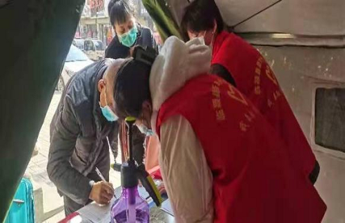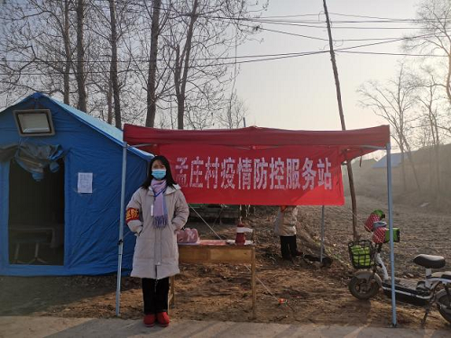 自1月15日,21动医04班的张宝樱在家乡河南省商丘市宁陵县开展疫情志愿工作,与其他志愿者一起对该小区进出的车辆和人员进行排查登记,记录人员出入时间和每日每户的出入次数,确保本小区安全。她说:“虽然有板凳可以坐,但大家都是流动的,所以基本上都是站着。尽管每天都很冷,但是为人民服务是我应该做的。”