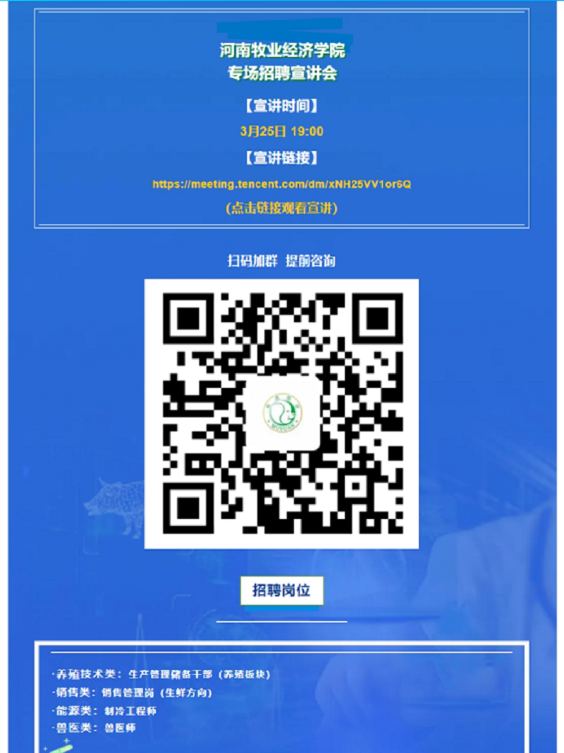 为进一步搭建毕业生就业平台,增强同学们对就业形势的认识,丰富和增长学生面试的经验和能力。3月25日下午,召开线上企业宣讲会,参会企业有牧原食品股份有限公司和大北农食品集团。