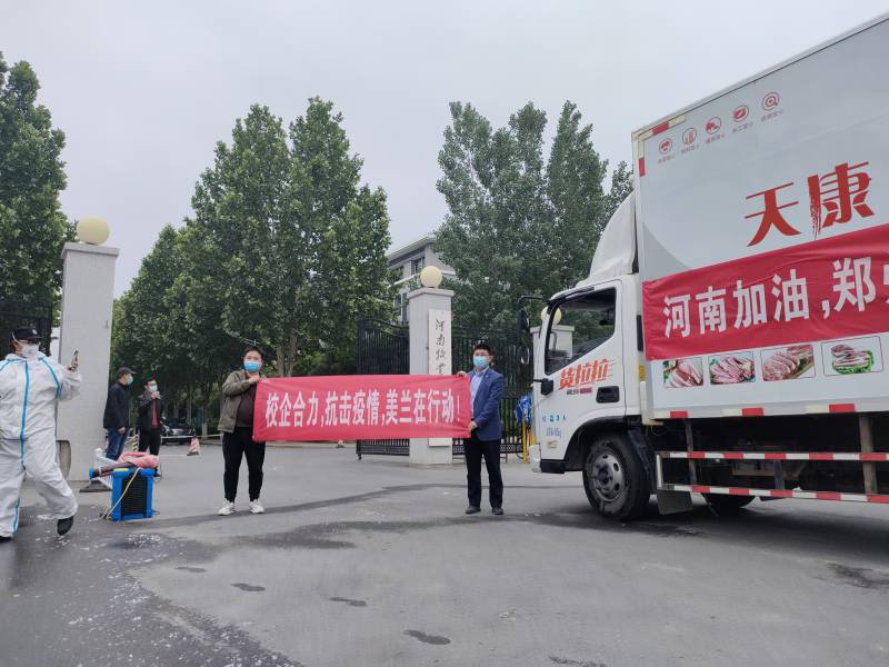 商丘美兰集团董事长姬星宇先生在郑州疫情宣布社会面清零,社会车辆不受限制当天马上联系物资,协调购买5万余元的生猪鲜肉送往母校。福建中易乐普生药业有限公司申学强董事长与总经理任倩倩购买1万余元的生猪鲜肉送往母校,着力改善学校师生生活,与母校携手并肩,同心抗疫,共度时艰。