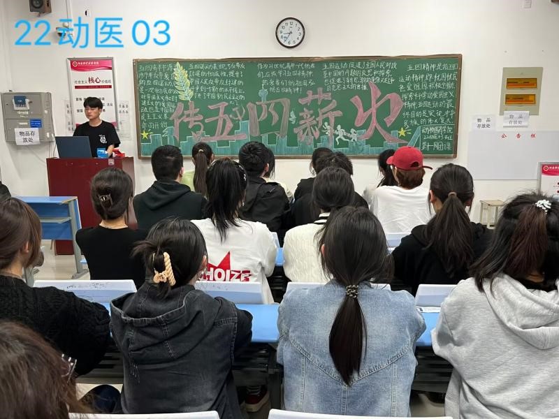 团课伊始,各班团支书通过视频给同学们讲解了五四运动的由来以及其重要意义,重点解读了以“爱国,进步,民主,科学“为核心的五四精神,强调了”青年兴则国家兴,青年强则国家强“的重要思想。随后主持人通过PPT演示带领团员青年认真学习习近平总书记《在纪念五四运动一百周年大会上的讲话》和《在庆祝中国共产主义青年团成立100周年大会上的讲话》,牢记总书记对对广大青年的殷切期待、对青年成长的深切关怀,教育引导广大青年自觉担当时代责任、勇于砥砺奋斗,勇做走在时代前列的奋进者、开拓者、奉献者。最后同学们自由发表看法,22动医01班的李明洁同学表示,纪念五四,不仅仅只是为了怀念,更重要的是,赋予那个伟大的日子与时俱进的精神内涵。作为新时代青年我们应该接过先驱们手中的旗帜继续前进,不断谱写青春奋斗之华章。