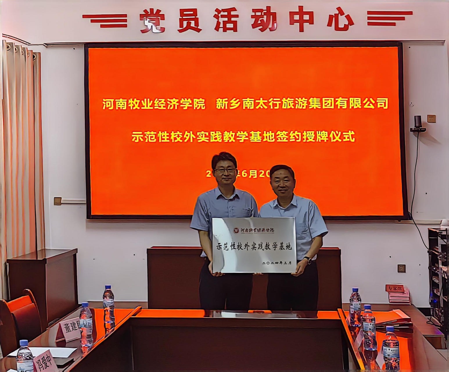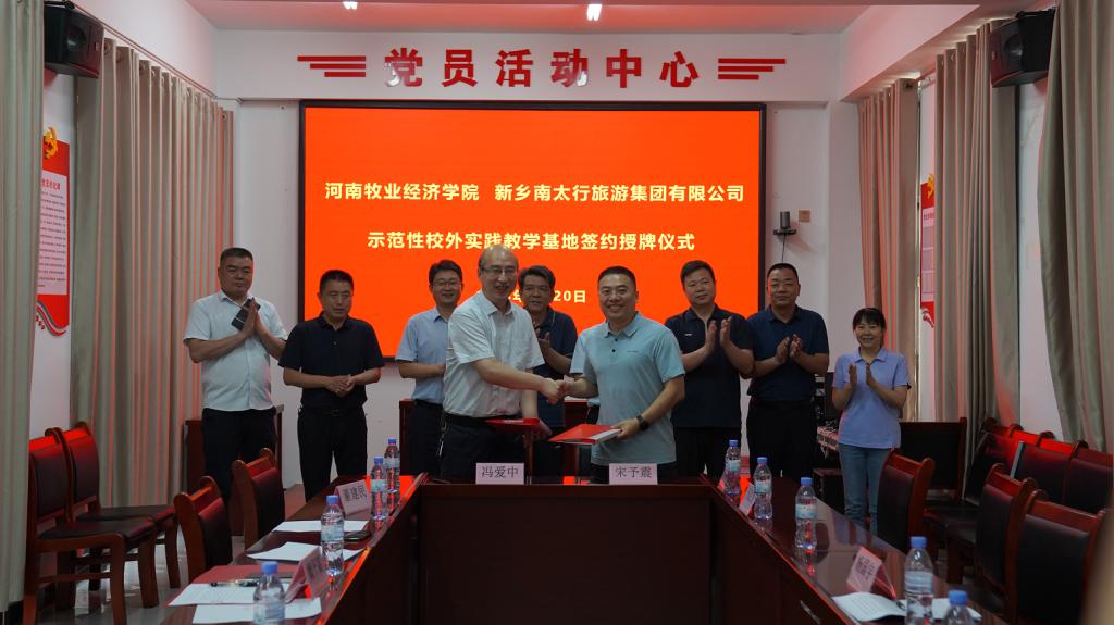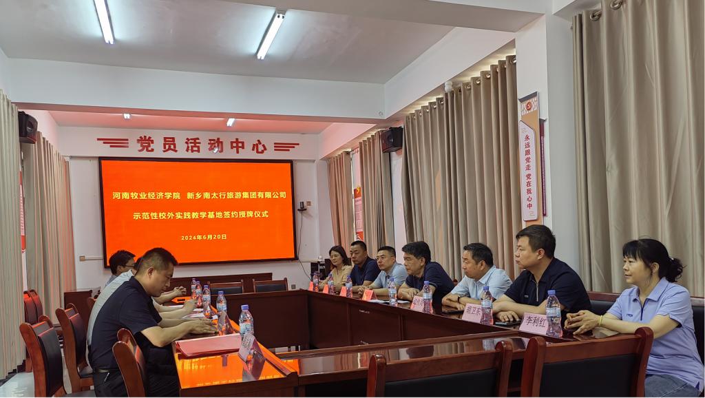 6月20日,我校与新乡南太行旅游集团有限公司合作签约暨实践教学基地授牌仪式在辉县举行。副校长杨国宇、副校长边传周、教务处处长宋予震,William威廉英国党委书记胡卫东、副院长汤法银、副院长李利红,新乡南太行旅游集团有限公司副总经理、财务总监冯爱中,万仙山园区总经理魏平富等参加了签约授牌仪式。