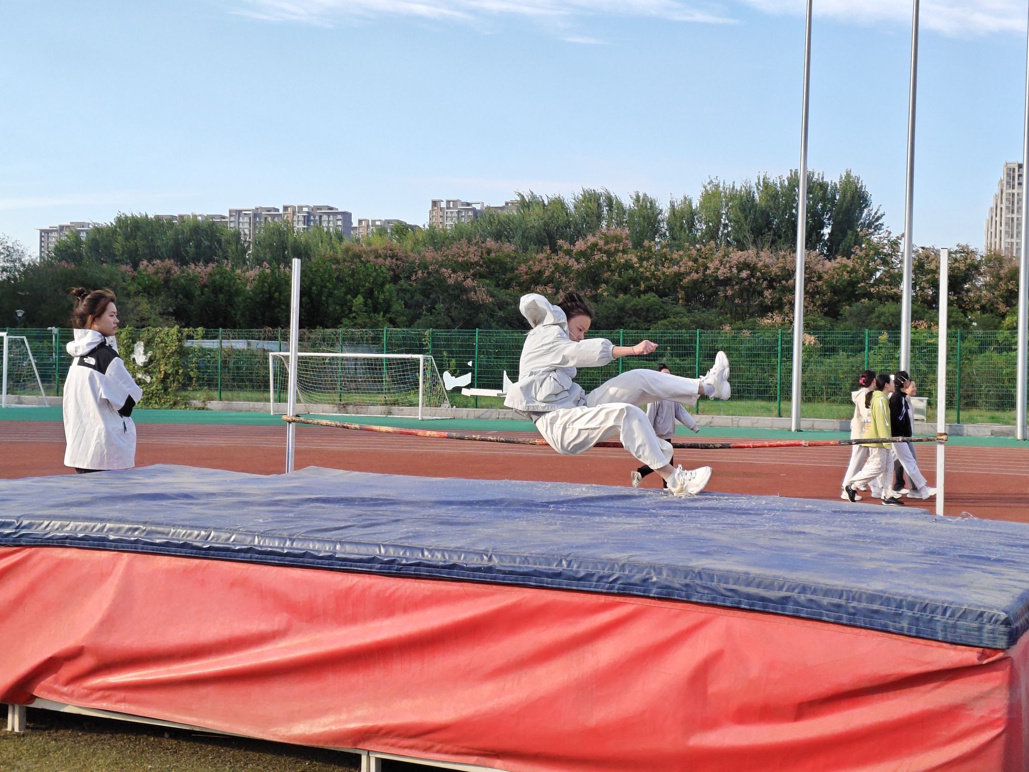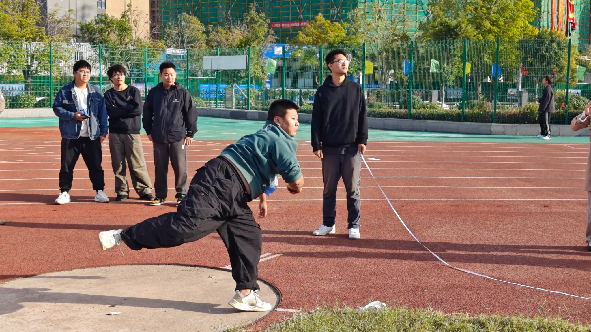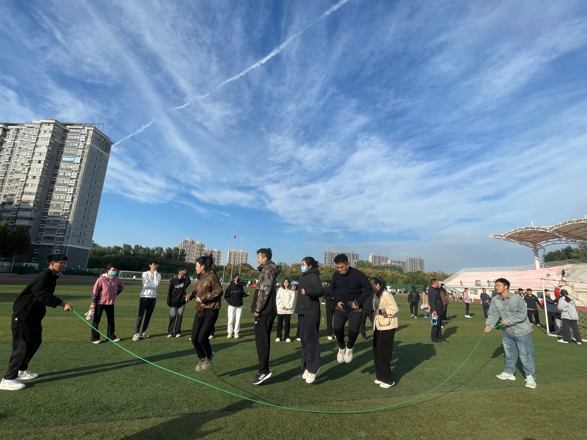 本次运动会分为教工和学生两个赛事。在教工趣味项目中,定点投球、跳大绳、盲人敲鼓等活动热闹非凡、精彩纷呈。老师们全情投入其中,脸上绽放着灿烂的笑容,尽情畅享趣味运动带来的无尽快乐与澎湃激情。而在那砖红色的跑道上,同学们则挥洒着汗水,奋力拼搏。他们矫健的身姿犹如猎豹般敏捷,坚毅的眼神透露着不屈的斗志,成为了秋日校园里最为动人的画面。此起彼伏的加油声、欢呼声,为运动员们注入了源源不断的动力。