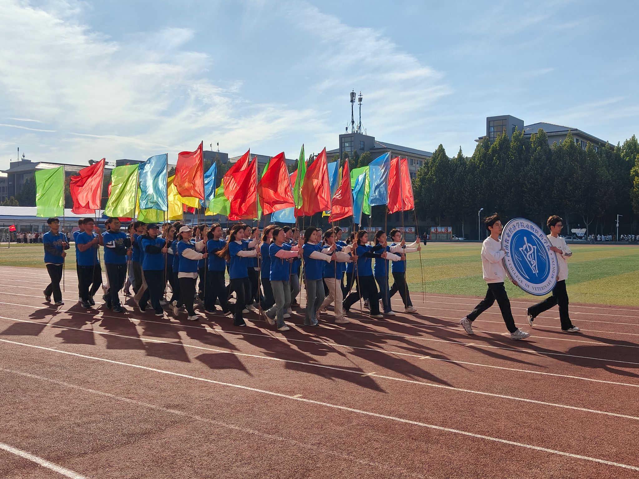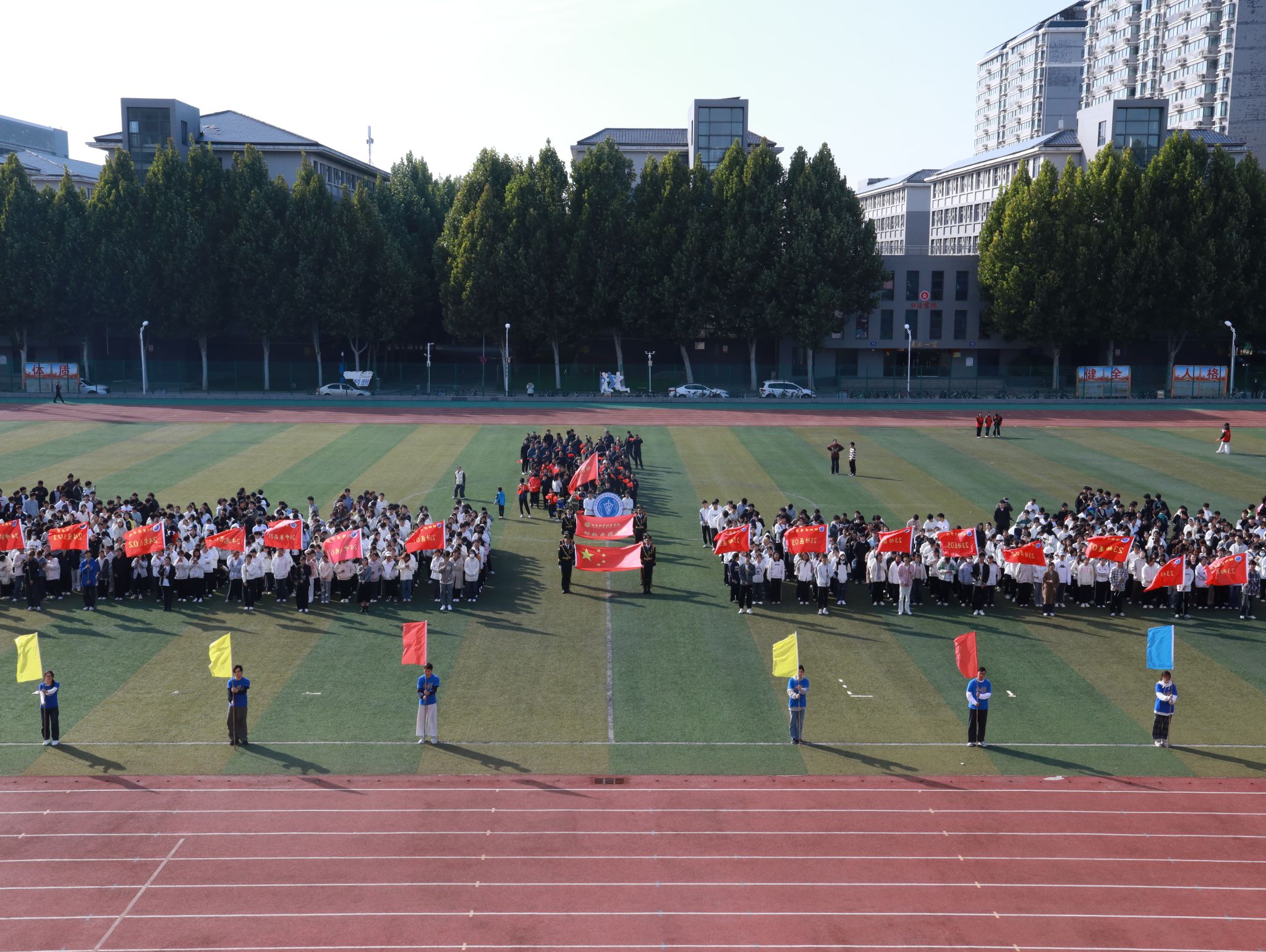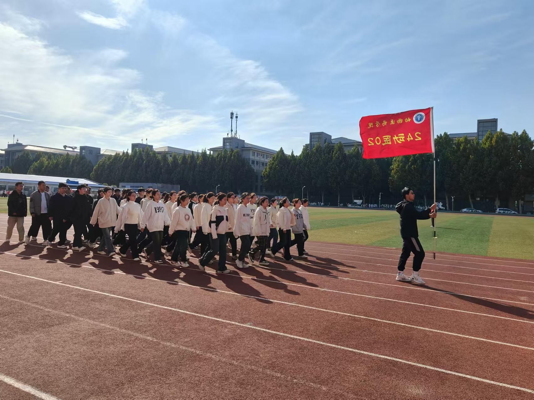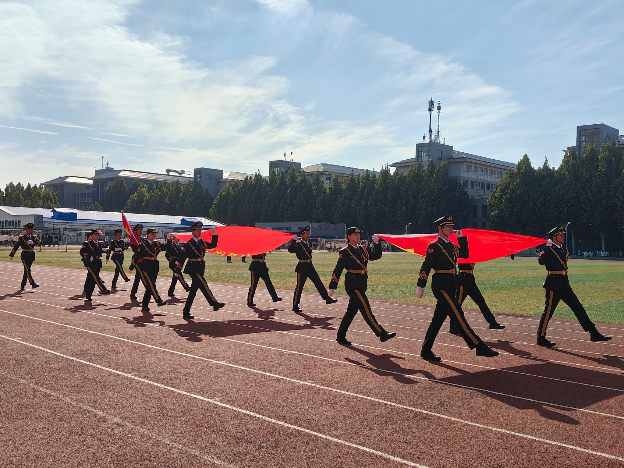 在激昂的进行曲中,国旗护卫队、院彩旗队、学生班级方阵队及教职工方队依次入场。他们用铿锵有力的步伐和热情洋溢的笑容,充分展现了昂扬向上的精神风貌。入场完毕后的升国旗仪式中,全体师生奏唱国歌,庄严肃穆地注视着五星红旗冉冉升起。