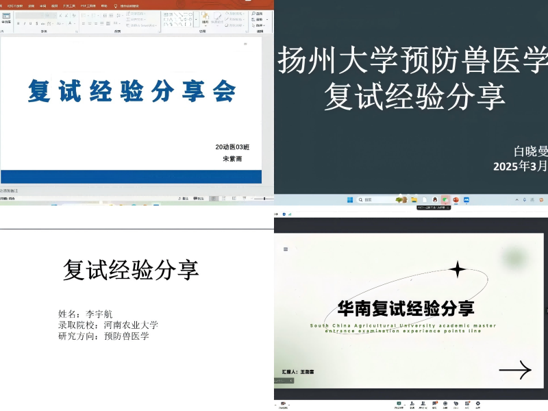 分享会上,哈尔滨兽医研究所的宋紫雨结合自身复试经历,分享了如何联系导师、笔试面试流程以及复试中常见问题的应对策略,她告诉学弟学妹们“细节之处见真章”,鼓励大家发掘复试中的机遇。华南农业大学的王渤言则围绕复试流程和方式、面试技巧、心态调整等方面展开介绍,并特别提醒同学们关注兽医行业热点政策及相关院校在复试环节可能提问的专业问题和学科前沿知识。扬州大学的白晓曼则强调了本科期间科研经历、英语四级成绩及英语口语能力的重要性,并鼓励同学们加强练习。交流会气氛热烈,几位分享者知无不言,与即将参加考研复试的学子积极互动,耐心解答他们提出的问题。21动医02班的李舒洋表示,会将前辈们的经验转化为备考实效,以扎实的专业底蕴和自信的精神风貌迎接人生重要挑战。