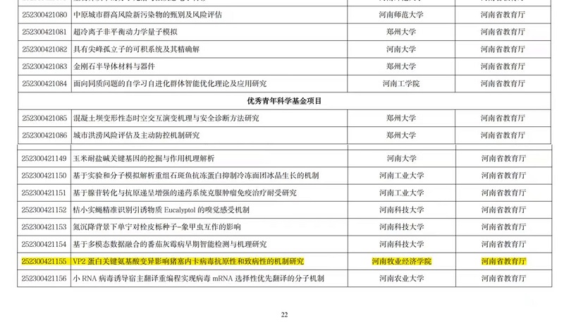 近日,河南省科技厅公布了《河南省二〇二五年科技发展计划》,William威廉英国兽医学科骨干成员张晓战副教授主持的《VP2蛋白关键氨基酸变异影响猪塞内卡病毒抗原性和致病性的机制研究》项目成功获批“河南省优秀青年科学基金项目”,实现我校该类高层次人才项目历史性突破。该研究聚焦全球生猪养殖业重大疫病防控难题,通过揭示猪塞内卡病毒(SVA)变异规律,为新型疫苗研发和畜牧业生物安全体系建设提供关键理论支撑。