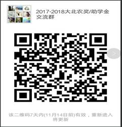 2.各获得资助学生应于11月14日前进入2017-2018年度奖助/助学金交流群(备注自己的群名称:学校+专业+姓名),群二维码见下图。