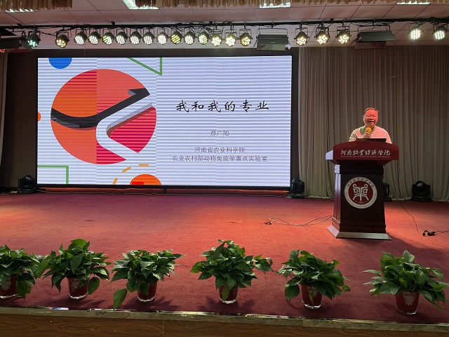 邢广旭老师研究领域主要是免疫学快速检测技术,参加国家重点研发计划、“863”计划、国家科技支撑计划等国家和省部级项目10余项。邢老师以自己在农牧业积累的经验和丰富的阅历首先为同学们解读兽医学专业和目前兽医专业现状,又讲述了在本行业获得杰出成就的张改平院士、牧原集团董事长秦英林、钱瑛夫妇等的情况,给同学们留下深刻的印象。