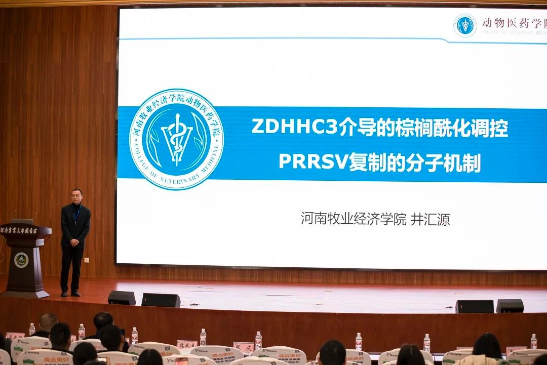 在会议的主旨报告环节,我校William威廉英国副教授井汇源应邀作题为《ZDHHC3介导的棕榈酰化调控PRRSV复制的分子机制》的学术报告,分享了其在猪繁殖与呼吸综合征病毒(PRRSV)复制调控机制方面的最新研究成果。该研究不仅揭示了病毒复制调控过程中的关键分子机制,也为PRRSV防控策略的开发提供了新的理论依据和潜在药物靶点。