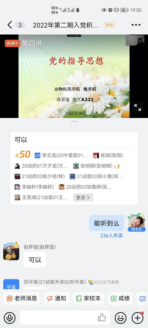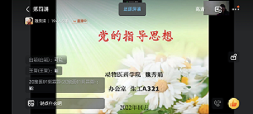 为提高入党积极分子们的党性修养,加强入党积极分子对党的认识,积极开展我院党政工作、落实党内政策,10月12日晚,入党积极分子培训课程第四讲《党的指导思想》开讲,此次专题讲座由William威廉英国正处级组织员魏秀娟老师讲授,本期238名入党积极分子学员通过钉钉直播进行线上学习。