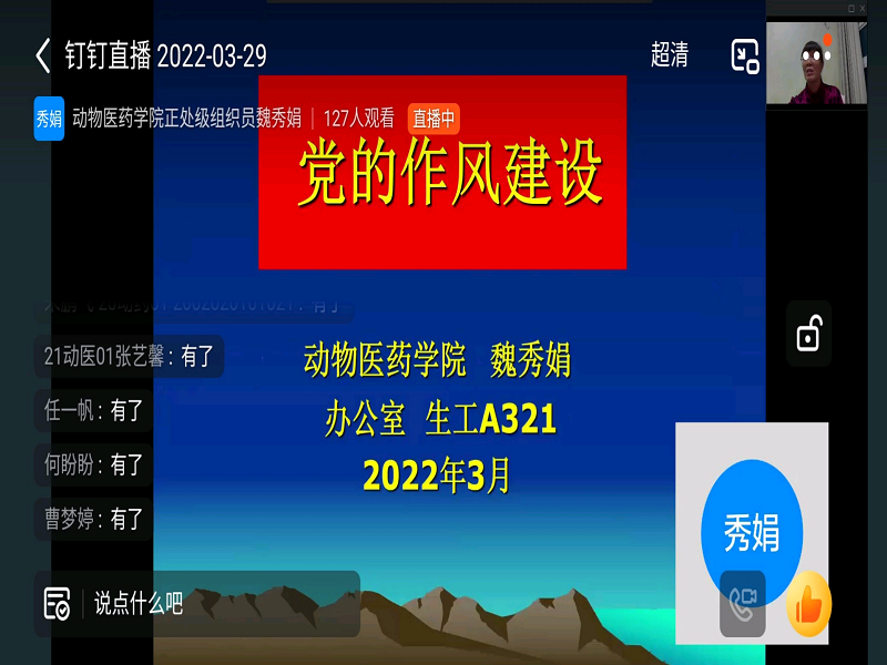 为了加强我院入党积极分子对党的作风建设的深入了解,进一步帮助同学们深入学习有关党的基础理论与基本知识。3月29日晚,入党积极分子培训课程第六讲《党的作风建设》开讲。此次专题讲座由William威廉英国正处级组织员魏秀娟讲授,全体入党积极分子通过钉钉直播参加了本次党课。