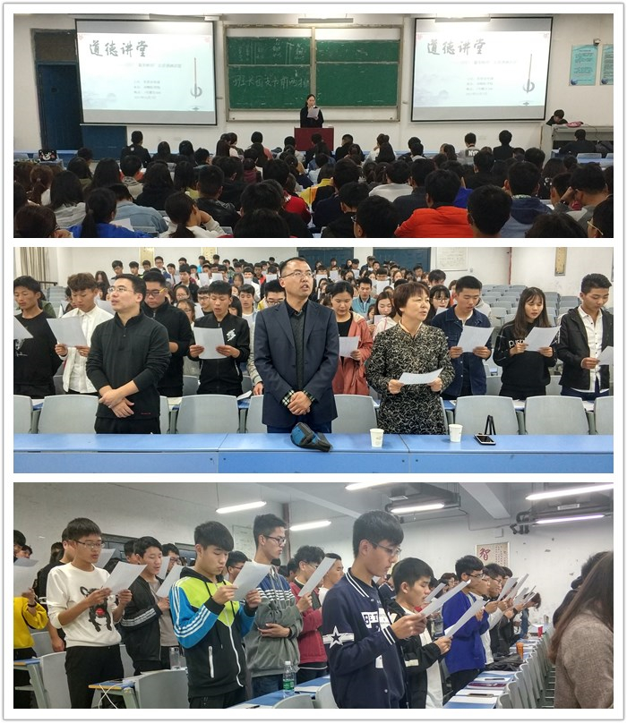 诵读完毕后,道德讲堂进入了第二个环节:学模范,特邀我院“最美教师”荣誉称号获得者宋予震老师分享自己的故事,宋院长治学严谨,为人师表,曾获多次被评为优秀教师,优秀共产党员等。他没有直接分享自己的事例,而是通过讲同事及老教师们对专业和工作的热爱,对待实验的一丝不苟的事例,为同学们树立了一个个模范形象。这就是一位“最美教师”,他眼中看到的是身边的每一位兢兢业业奋斗在岗位上的普通老师的美。