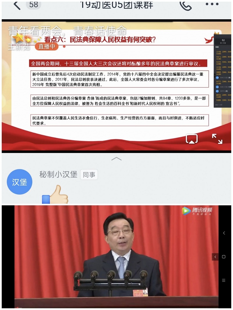 2020年5月28日,下午2:30至4:00,我院组织19级各班在钉钉团课群中开展以“青年看两会,青春话使命”为主题的团课学习活动。
