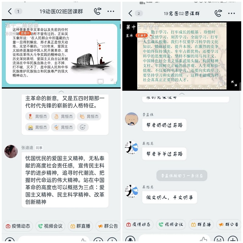 本次团课以直播的形式进行,主持人以深入简出的方式给同学们讲解五四精神,并以此次疫情为例,将五四精神与本次疫情联系起来,帮助同学们更好的认识五四精神。疫情中众多青年志愿者从五湖四海齐聚湖北武汉,勇挑重担,奋斗在战疫一线,虽然他们的年龄不大,但他们肯吃苦不怕累,把危险留给自己,把安全带给他人。五四运动所体现的“爱国、进步、民主、科学”精神,在他们身上表现的淋漓尽致。接着,同学们纷纷发言,表达出保家卫国的决心和对自身责任的深刻认知。在五四精神的感召下,一代又一代青年始终站在时代前列,不屈不挠地奋斗,历尽艰辛地求索,创造了令人赞叹的光辉业绩。最后,主持人总结到:本次疫情是对我们这一届青年的考验,也是我们的成人礼,更是我们尽自己所能为祖国贡献一份力量的时刻!