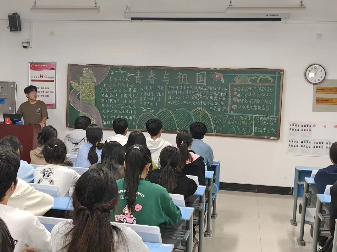 在团课开始前,各班努力搜集相关资料,绘制黑板报,合理分配工作,为团课的成功展开做了充分准备。团课伊始,主持人通过PPT演示让同学们了解党领导中国青年运动的光辉历程,使同学们对在中国共产党领导下取得的历史性成就和发生的历史性变革有了更加直观的认识。同时还讲解了不同时代的英雄事迹,激发同学们的爱国之情。随后,通过观看经典红色电影,使广大青年学生感悟初心、勇担使命,凝心聚力、接续奋斗。接着,主持人带领着大家一同朗诵经典美文,以文字为载体,以语言为力量,有声表达对祖国母亲的祝福。在团课的最后,各班主讲人再次强调了本次团课的主题,并号召所有青年艰苦奋斗,强我中华,勇担时代重任,用实际行动践行爱国主义,为祖国的繁荣富强奉献青春力量。