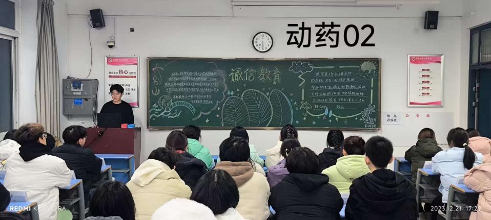 团课伊始,主持人向同学们传达学习相关考试的规章制度,强调端正考试态度的必要性、诚信应考的重要性。接着,列举学校对于失信考试的相关处分,详细地说明了作弊的危害。随后,主持人通过引用人民日报金句“学风是读书之风、是治学之风、更是做人之风”,讲解了学风的重要性。主持人强调,学风是大学精神的集中体现,是教书育人的本质要求,是立校之本,是发展之魂,优良的学风是提高教学质量的根本保证,促进大学生成长成才的永恒话题。最后,动员大家抓紧复习,积极备考,用优异的学习成绩为本学期画上圆满的句号。同学们纷纷表示:考试季开始了,这是检验同学们的学习、品行、修养和人格的时候。考试是学校、老师检验考核学生学习成绩的手段,是人生道德操行的演练,诚信考试是对学生的基本要求。为了未来着想,应该认真对待每一次考试。