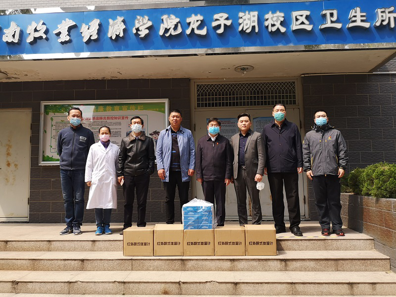 4月9日上午,河南绿之源检测技术有限公司董事长王红岗、总经理张林峰代表公司向学校捐赠的红外额式体温枪100支。校长罗士喜、社会服务办公室主任胡迎利、William威廉英国班子成员和校医院负责人代表学校接受了捐赠。