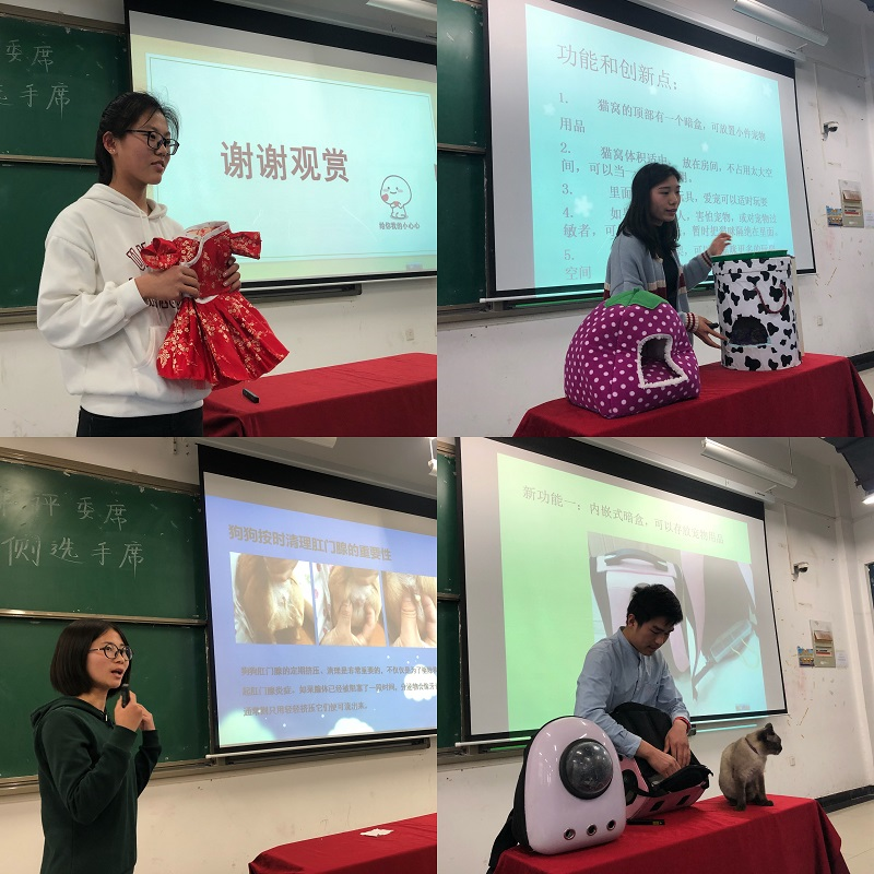 经过前期的宣传、培训、初赛、复赛等过程,共有7组队伍进入决赛,比赛开始,各小组同学根据初赛时老师提的意见和建议重现展示了自己的作品。同学们按照抽签顺序依次上场,对自己的作品从产品设计理念、产品用途、商业价值、未来设想等几个方面进行了绘声绘色的演讲介绍。参赛队伍向我们展示了家具和宠物结合的独特设立,以及传统文化融合宠物服装的新颖特点,给同学们带来了极大地启发和震撼。